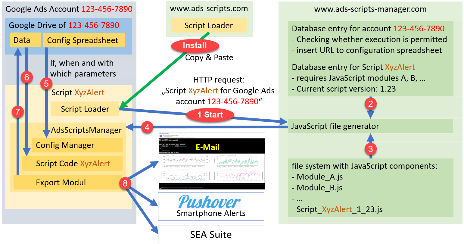 As you can see in the diagram below, there is a strict distinction between what happens in your Google Ads account and what happens on our server. The data and results of scripts remain in your Google account or are sent to the users you have defined. Our server only delivers the scripts suitable for your Google Ads account.